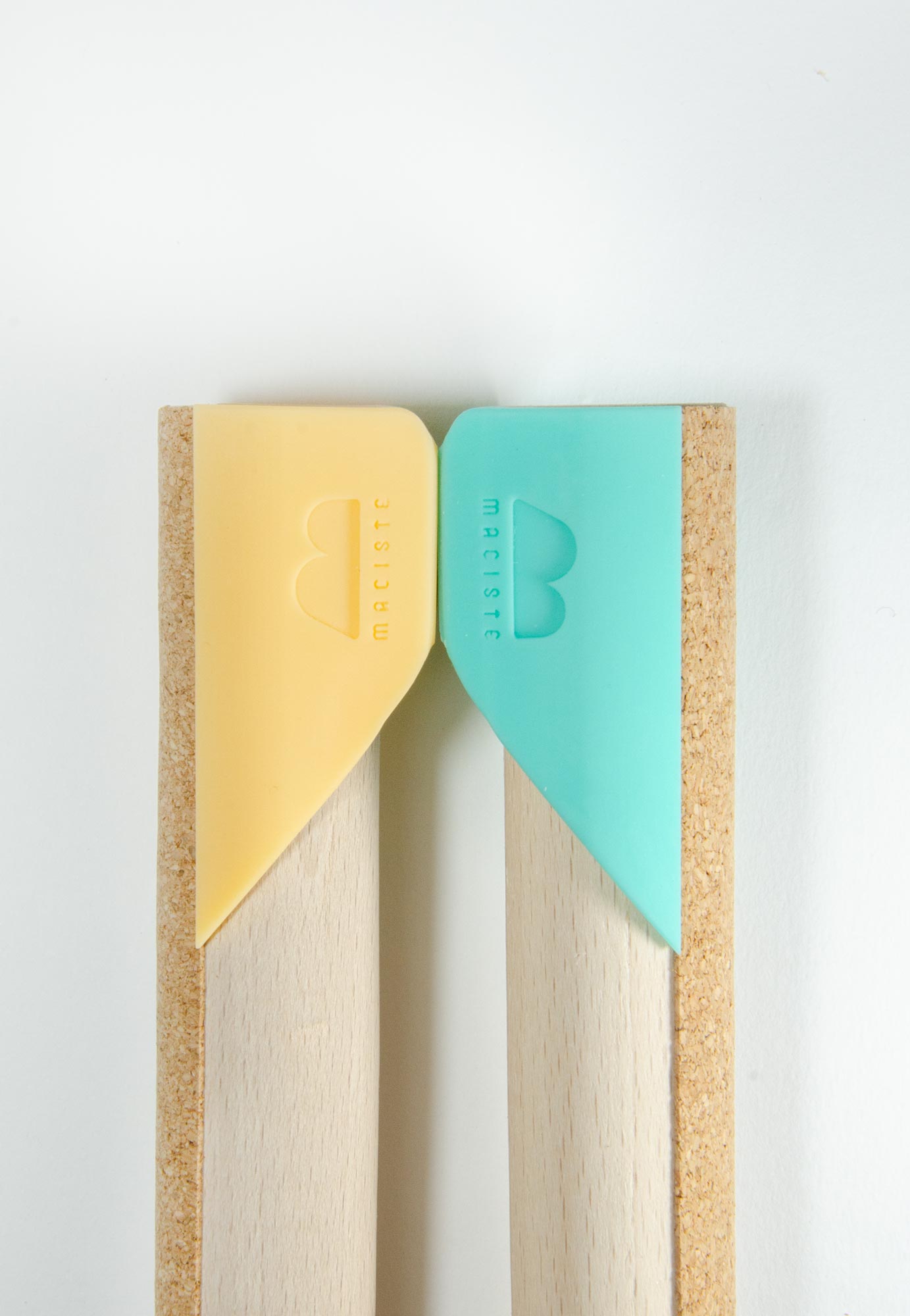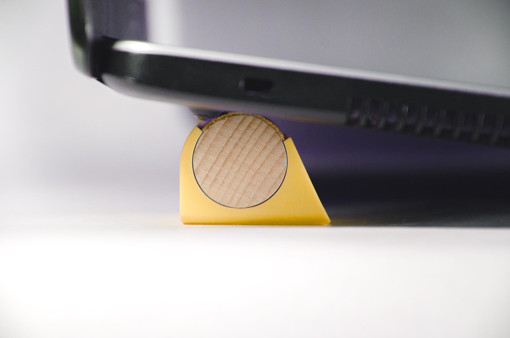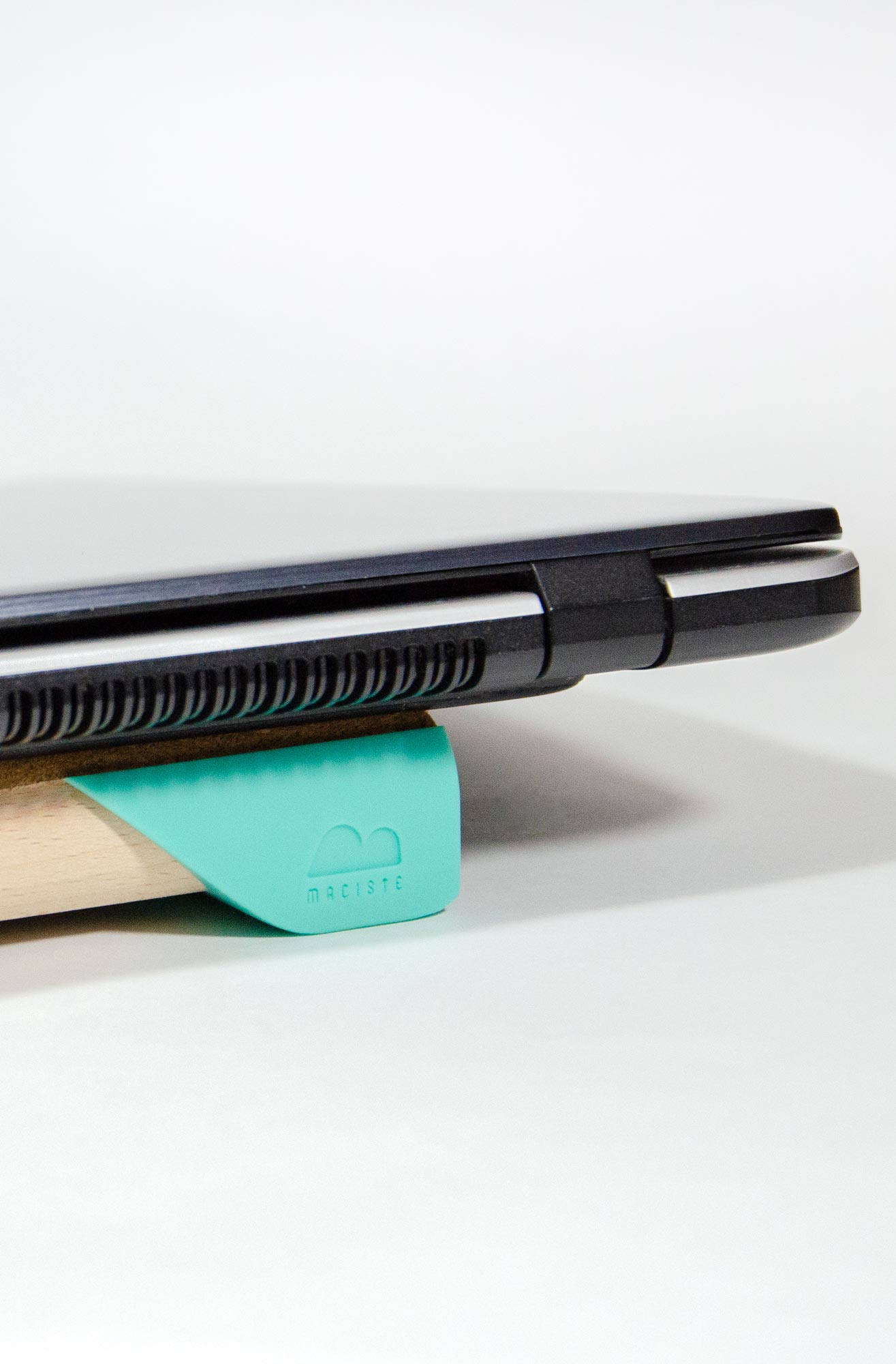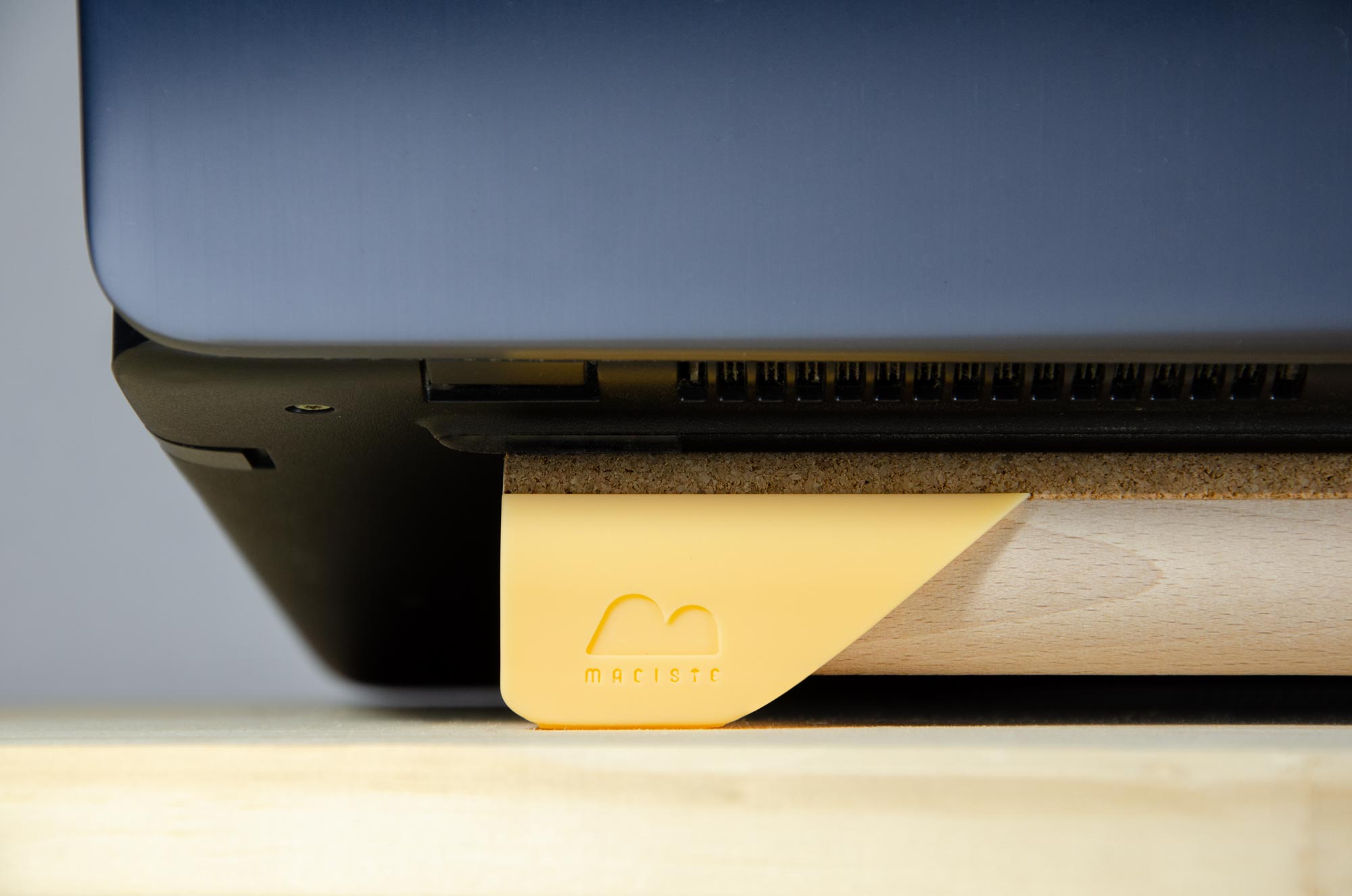 I materiali principali di cui è composto Maciste sono legno e sughero. La curvatura del cilindro di legno unita alla superficie in sughero consente al pc di evitare lo scivolamento.